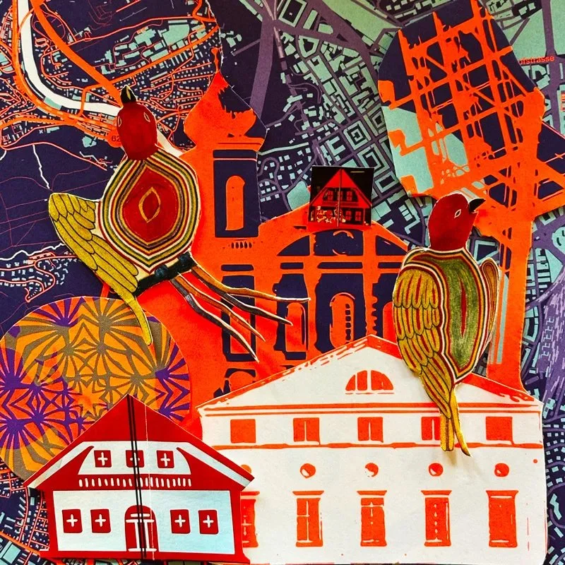 I clipped the maps, buildings, and grids in this colorful paper collage from a community theatre prospectus that I picked up in Lucerne, Switzerland on the way to my annual Mountain Rise writing retreat. (What an amazing week that was!) The two appliquéd birds graced a postcard that I purchased in early June at the Victoria & Albert Museum in London, and I cut out the two Swiss chalets from a tourist brochure advertising tours of a chocolate factory.